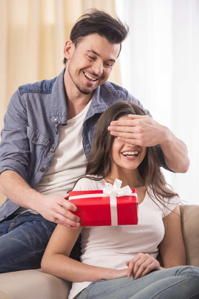 Couple Published at 668 × 1000 in Couple Young man is covering the eyes of his wife and giving her a present at home. best christmas gift ideas for wife