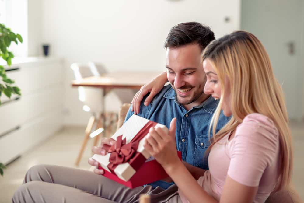 Young couple celebrating at home Published at 999 × 667 in Young couple celebrating at home Cheerful young couple celebrating at home. Man giving gift to his wife. christmas gift for wife